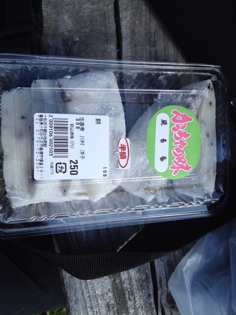 汗で濡れた服を干しながら物産店を回ります。半額の餅を見つけたので購入。125円。