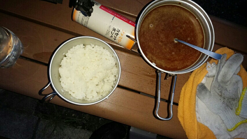 5時 通路の隙間でおはようございます。朝食は今日もカレーです。