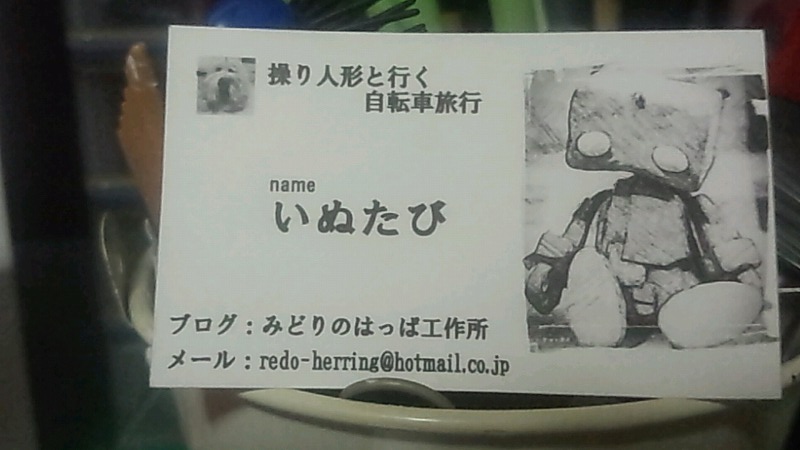 10月29日 神奈川 名刺をつくるのさ 南下編(関東〜中部) 2015年10月29日 天気曇り こんにちは。いぬたびです。11月1日からまた旅に出ようかと思います。そろそろ日記を再開しましょう。まずは北海道を回るあいだに名刺がなくなってしまったので新しく印刷します。せっかく自分で作るのだから名刺だって遊ぶべきですよね。すでに旅は始まっているのです。北海道で使っていた時の名刺の最大の特徴は両面印刷でスマートだった事なのですが、それを踏まえた新バージョンの名刺1号 変更点はQRコードや出発日を削除して片面印刷に変更してみました。理由としては、一番大事な事は「ブログ名だから」です。ブログ名で検索してもらうので、「みどりのはっぱ工作所」は表に印刷すべきと判断。名前はあまり大事ではないのですが、真ん中にないと名刺らしいスマートさが無くなってしまうので据え置き。そう、ブラウンと旅をしていると大体の人からは「操り人形の人」か「犬の人」と呼ばれるので正しい名前は覚えてもらえません。親しくなってからじっくり名前は覚えてもらえるよう努力します。また空白を多く残すことで、必要になったらTELやLINEなどの情報を手書きできるよう配慮した配置です。第二号名刺 まさかのカラー印刷。一番良く使うブラウンを前面に押し出すことでマリオネットの説明をしやすくしていきます。さらに文字情報を最小限に抑えて、渡した瞬間に必要な情報を伝えていきます。必要な情報はブログを見てください!というスタイルです。同じコンセプトで3号と4号男鹿半島の写真で「操り人形と旅してるよ!」感をだしてみたり、 白神山地のブラウン。ブラウンの全身がわかり易い一枚を使用してみる。 ただ、枠いっぱいに写真を使ってしまうと、はみ出したり空白ができたりで、きれいに作るのがめんどくさいですね。やっぱり一枚目が一番お気に入りかなー?あー楽しんだ楽しんだ。9月16日 一気に家へ一時帰宅(事故の後処理の為)10月29日 名刺を作るのだ10月31日 明日から出発です今回の旅の経路について→操り人形と自転車日本一周 記事まとめRIXEN&KAUL(リクセン&カウル) デイパックボックス KT811新品価格¥11,840から(2018/6/21 11:53時点) PR