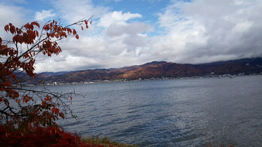 諏訪湖到着。気温は13度、でも湖の傍は風が強いので寒い!!