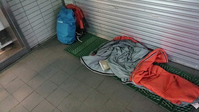 23時 さー寝ましょう。室内と呼んでいいかわからないが自販機のある場所がいい感じなのでそこに寝袋敷いてねましょう。