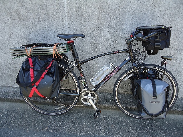 収納用品(リア、フロントバッグ、バックパック) 自転車旅行 2015年05月10日 【持ち物リスト】 ・自転車本体とその周辺パーツ・収納関連(リア、フロントバッグ、バックパック)(現在のページ)・機器関連(スマホ、タブレット、バッテリー、ソーラーパネル等)・日常関連(衣類、貴重品、清潔、調理)・旅の相棒(操り人形、一眼レフ) 【パニアバッグ(リアサイドバッグ】moutom 完全防水DRY Xサイドバッグ・Xのシルエットにひとめぼれ。でもテントを入れるには少々サイズが小さかった為、オーダーメイドして少し横に長くしてもらっています。moutomさんのパニアバッグ。HPからオーダーメイドも可能です。確か手数料は2000円くらいだったかな?ターポリン製で防水です。ただし中には仕切りもなにもありません。2015年5月に遭った自動車との事故により破損してしまったので、半年後にオルトリーブに変更してします。完全防水DRYサイドバッグ 自転車用【フロントサイドバッグ】オルトリーブ フロントローラークラシック超有名どころですね。評判通り丈夫でとても使いやすいです。もっと旅しないと書く事ないよ!基本的に弱点なし。ちょっと高いくらいかな?防水性についても問題ありませんでした。左側のバッグが丁度縁石の高さ位なので、バッグの底が擦り切れて穴が空きました。まあ、私が歩道寄りに走り過ぎてたんですね。ORTLIEB(オルトリーブ) フロントローラー クラシック イエロー F635【フロントバッグ(ハンドルバーバッグ】リクセン&カウル デイパックボックス KT811100km圏内のツーリングのメインバッグ。中にカメラ用緩衝材に入れた一眼レフがぴったり入ります。普段3Kg以上入れてるはずだが、ワイヤーにより支えられて未だにお辞儀した事はありません。容量は8L。ちなみにこの場所は最高に日当たりが良いので、この上にソーラーパネルを設置しています。(機器関連参照)RIXEN&KAUL(リクセン&カウル) デイパックボックス KT811【バックパック】コロンビア パッサダスRT30直接体に装備するものなので、こいつは店舗で選んで買いました。決めては色合いです。緑色大好きです。容量30L。2気室構造で下からも中の物を取り出すことができます。便利!ちなみに普段ここにもソーラーパネルを取り付けてます。でもこちらは発電率はイマイチです。腰のベルトがこれ程軽く感じさせてくれるものだとは知らなかった。なんだか凄く山に登りたくなりました。[コロンビア] Columbia パッサダスRT30 PU7034-F13 010 (Black)【ボストンバッグ】なんか昔から家にあった50Lくらい入りそうなボストンバッグ PR