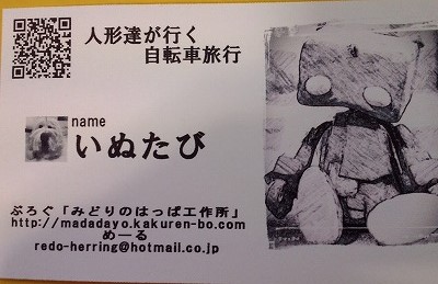 名刺つくってる 自転車旅行 2015年02月07日 うん 名刺つくってるの 仕事辞める前に職場に配ったり、旅先での出会いを大切にしたいのです。 なにしろ私は口下手だから用意が肝心 いまこんな感じ 無料でQRコードが作れることにびっくりした まあまあいい出来だと思ってますよ 自画自賛ですが。 正直これで完成でもいいんだけど、 「いぬたび」の左のブラウンのアイコンが ちょと うるさい 右の絵とQRコードが全体のバランスを取ってるような気がするのでブラウンがなんだか邪魔してるきがする。 でもブラウンの絵を入れないと、「いぬたび」の何がイヌが何を意味してるのか連想しにくくなりそう。 ※ブラウンは犬のマリオネット(工藤和也さん作のモフィーのこと) そこで 写真の代わりに簡単なイラストを入れようと思う さささっと描けちゃうかんじの でも 私はイラスト苦手なんだよー PR