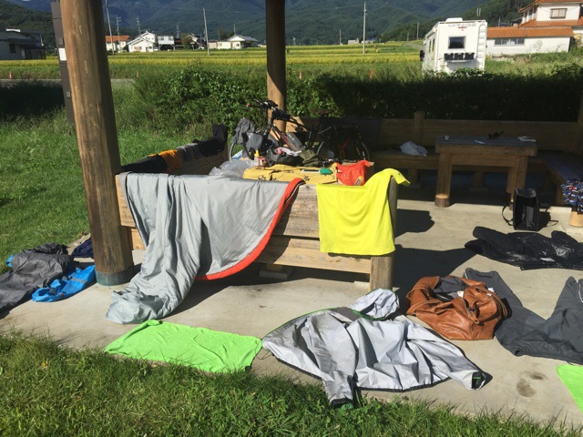 9月10日 長野青木村 本日も休息なり 南下編(中部〜関東) 2015年09月11日 天気晴のち雨 気分85だらだら6時 起床、むにゃむにゃ(ー ー;)7時 っは(@_@)明るい、そして暖かい。日が出てる!!はいはい、道具干しますよー、全部出してくださーい。ブラウンも干しちゃう。ちゅうぶらりーんU・x・U暖かく感じるこの日差し、今月初めてじゃなかろうか(@_@)10時 ふー、やっと終わった。紙類のダメージが深刻(ー ー;)地図とか手紙とか、、、11時 話によると栃木の方が大雨で深刻な状態とのこと。近づくべからず、と教えられる。今日は青木村を観光、、、と思ったが、今日は温泉でゆっくりします。やってきました「くつろぎの湯」ここは300円なのに、浴場もえらいでかく石鹸付き、休憩所は20時までで、食べ物も持ち込んで良いとのこと(@_@)天国じゃないかここからダラダラタイムです。ひたすらゴロゴロ(@_@)ゴロゴロっは、気がついたら携帯の電池なくなってた(°_°)しかも台風を心配する連絡がチラホラ、、、ごめんなさい。無事です。15時 わー、雨降り出したー。予報通りだけど。18時 ちょっと早いけど、雨上がりの隙間をぬって、退散!ぴかっ、ゴロゴロ、、、、(°_°)え?不穏な気配、、、ドザーーー(@_@)ぐわー突然の豪雨と風。すなわち嵐。幸い濡れたのは15秒程度。早めに出てきて助かった。風も出ているので東屋では寝れないと判断。長細い軒下を選びます。布も含めて、3方向からの風を防いでくれる。食事処こまゆみは鉄壁の要塞じゃ(°_°)20時 お、止んだ(°_°)もう降らないと予想。テントは要らないだろう。21時30分 シュラフに入って日記書いてまーす。22時 おやすみなさーい。9月 9日 長野県青木村 ザーザーグーグー9月10日 長野県青木村 本日も休息なり9月11日 じりじりと軽井沢へ→操り人形と自転車日本一周 記事まとめ PR