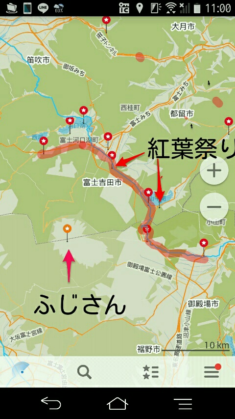 11月7日 紅葉真っ盛り 南下編(関東〜中部) 2015年11月08日 天気曇り 寒い!何だか寒さが堪えるっ、といっても日中で13度くらいかな。6時 起床。トラックの運ちゃんが頻繁に入ってくるのであまり寝心地良くない(・_・;)8時 出発!まずは山中湖を目指しましょう11時 ややや、山中湖の近くで紅葉祭りがある様子。行こう行こう。富士山は残念ながら雲で見えなかったが、紅葉真っ盛り。ライトアップもされるらしいが、明日から雨ですからねぇ、、、待ってるわけには行きません。12時 先に進んで道の駅富士吉田。富士山に最も近い道の駅って自慢してた。ふむふむ。って、ここでも紅葉祭りをしてました。ここで泊まっても良かったのですが、やはり大きな峠の手前まで行きたい。15時 道の駅なるさわ到着。今日はここまでかな。うー、、、寒い。今日は昼間も13度。時間も早いし、鉱石ミュージアム見学。なぜかティラノサウルスがいます。実は結構標高も高かった。寒いとやる気が削がれてしまって、やろうと思っていたことにもエネルギーが行き渡りません。ゆっくりと体を慣らしていきましょう。じゃ、寝よ。11月 6日 再出発ですよ11月 7日 山中湖 紅葉まっさかり11月 8日 雨が降ったらお休みで→操り人形と自転車日本一周 記事まとめ PR