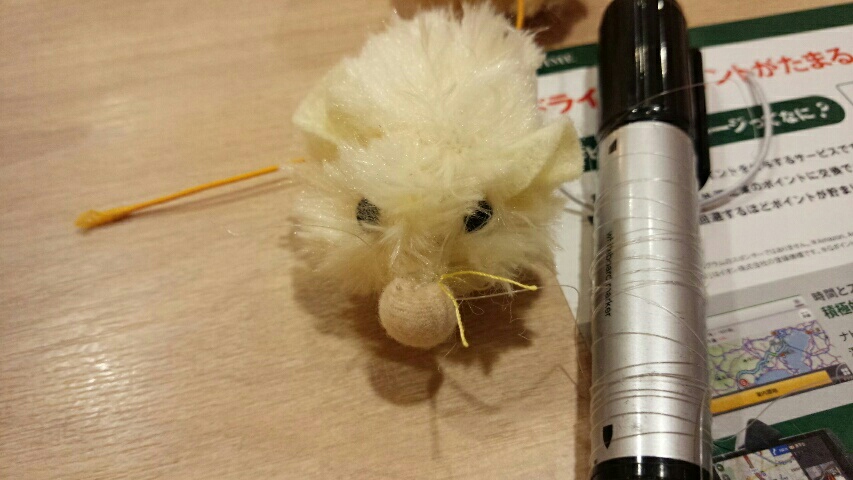 第六回 糸がついてりゃ操り人形、あとおまけ 終着地編(沖縄) 2016年01月04日 お久し振りです。いぬたびです。ペルチエさんの体が旅に耐えられない様子なので、ブラウンと引き継いでいきましょう。今日はブラウンと投げたボールキャッチする方法を色々考えてみましょう。と、なるはずだったのですが、100円均一で買ってきたボール役のチュー君に愛着が沸いてきて、頭の中で勝手にチョコマカ動き出してしまいました。そういうわけで今回はこの子を動かしてみましょう。えーと、想像しましょう。ネズ君がチョコマカ餌を探していると、ブラウンに見つかって追いかけっこになるのですよ。食べられちゃったら可哀想なのできっと最後は上手いこと出しぬけるのでしょう。丁度トムとジェリーみたいに。と言うわけで、鼻をひくひく、落ち着き無くせわしない動きを目指しましょう。まずそのまま糸をつけても動かないので、七匹の子ヤギのオオカミのように、ズバァーっとお腹を切って重りをいれます。重りは10gくらいが丁度いいかな?糸は、鼻とお尻の2本。ネズミが尻尾で感情表現してるの見たことないので、尻尾糸はいらないかな?コントローラーは、ペンでいいか。前後のキャップに糸を挟めば容易に糸を調節できる便利道具。完成です。ふむ、初めから割と上手くいってしまった。改良点がないとつまらないぞ?~~~~~もう一匹いるので、この子は指人形、アクションアニマルにしてみましょうか。もっと古いとハンカチネズミですね。ちょっと小さいけど。また、お腹を切ります。今度は親指がぴったりはまるくらい。これだけで完成。ちょっと小さい気もしますが、かわいいじゃないか。1月 3日 やる気でないのさ1月 4日 離島準備と、、、?1月 5日 いざ石垣島へ、そして自然の手荒な歓迎→操り人形と自転車日本一周 記事まとめ PR